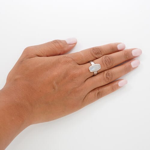 The Silver Rectangle Rainbow Moonstone Ring is a sterling silver ring. It has a rectangle rainbow moonstone, size 7.5. R650.
