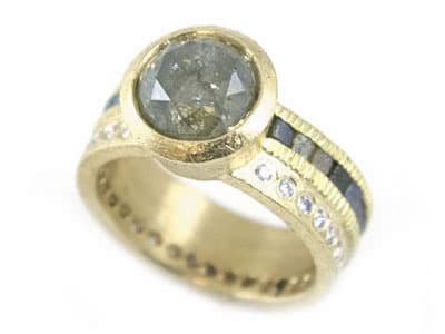 --Continue Reading--We recently added some new engagement rings from Todd Reed to our collection and I have a new favorite Reed ring. The r405 in palladium pictured at right is an absolute gorgeous, stunning ring. It’s a .80 ct fancy white diamond, surrounded by raw cubes on the setting and the band and interspersed with 7 brilliant cut diamonds to add a little extra pizazz. The center stone, like many of the other stones Todd uses, is difficult to categorize in one color. It’s a clearish, white stone with a subtle hue of tan, pink, and orange, with darker inclusions of browns. I know I just named around 8 different colors, but see it in person and you’ll know what I mean. I could gush over this ring for days. It is truly beautiful. Of course, it pairs perfectly with the r400-hb in palladium. We also added 2 new rings in the solitaire r480 and r481 styles. The r480 is a fabulous, pinkish orange stone that pairs perfectly with the silvery palladium. The r481 in yellow gold has a great deep reddish brown stone. This version of the r481 has a thinner 2mm wide band, which makes it very delicate, yet still makes a statement like all other Todd Reed rings. We will be seeing everyone from Todd Reed at the upcoming Rosen Show in Philly, so I’m sure we’ll find lots of other rings to fall in love with from them!