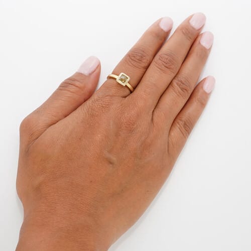 This 18k Yellow Gold Square solitaire features an amazing square 0.75 carat yellow fancy cut diamond. Approximately 0.10 carats of white diamonds surround the center diamond in a halo. Currently, size 6.5 in stock, however we can have Todd Reed resize it to fit any finger at no additional charge. This 18K Yellow Gold Square engagement ring is both simply designed and elegantly presented. R481 18k Yellow Gold sq107.
