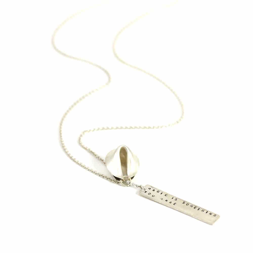 A small hand formed fortune cookie hangs in the front of this lariat with a hand stamped fortune message hanging next to it. The cookie slides on the chain making the necklace adjustable.