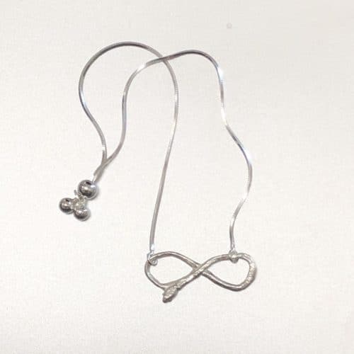 The Adjustable Infinity Bracelet is absolutely gorgeous. It has a beautiful square shaped snake chain made of sterling silver. It is looped through a silver ball with adjustable ends. A wonderfully designed piece, this bracelet is one of our favorites! It is approximately 8″ in in length. Adjustable Infinity Bracelet by Nancy Nelson.