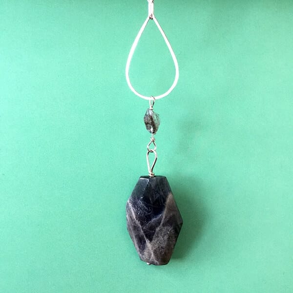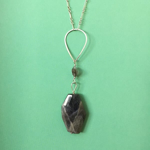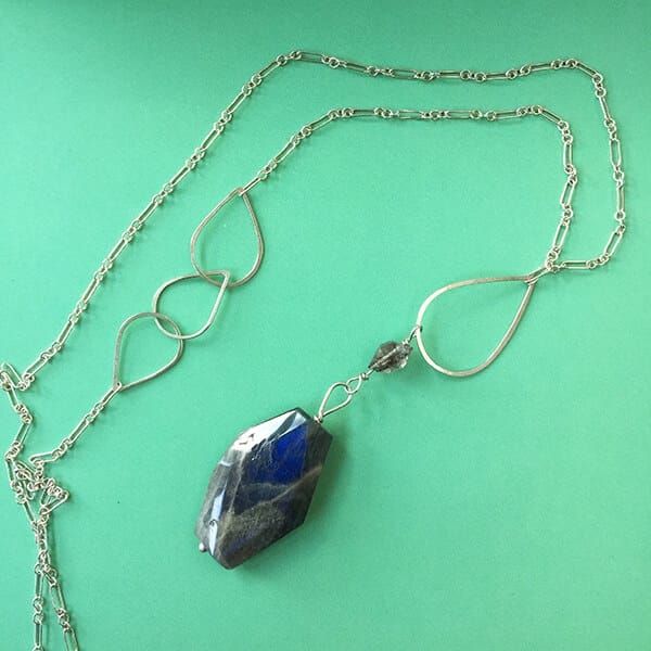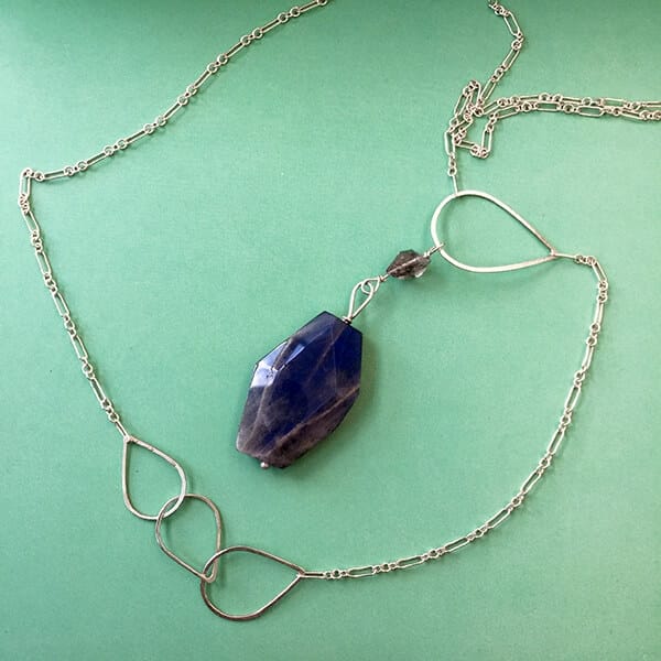 View ArtistGorgeous Agate Teardrop Necklace. It has three interlaced teardrops on one side and a large teardrop with an agate suspended from it at the bottom. The agate is a stunning blue and black on one side and a marbled gray and white on the other. It is approximately 40″ long, made with sterling silver.