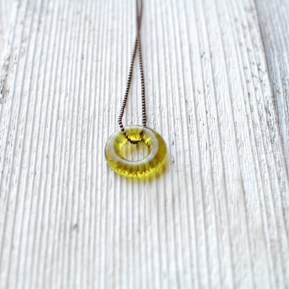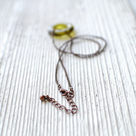View ArtistThe Amber Wine Ball Chain Necklace is handcrafted from an amber wine bottle, our simple and classic necklace is perfect for fall. The repurposed glass hangs loosely on an adjustable copper metal ball chain.