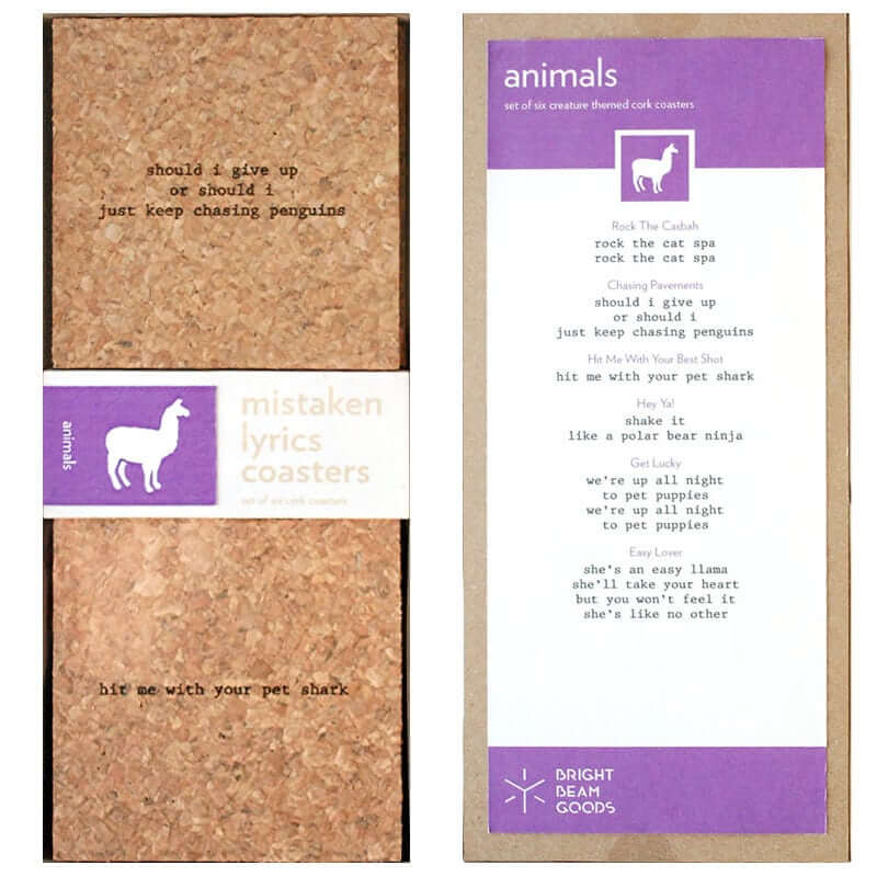 View Artistare you a fan of animals? i mean, really really a big fan of animals?! was your last purchase a matching sweater set for you and your four-legged friend? do you dream of leaving it all and starting an alpaca farm someday? and really, who isn’t a crazy cat lady these days?! if you answered yes to three or more of these questions, or if you know someone who would, these coasters are for you! they make the perfect gift for the fun-loving music-mishearing critter-cuddling loved one in your life — whether that’s you or ‘a friend.’
