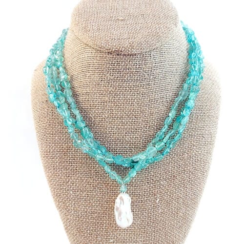 The Apatite and Freshwater Pearl Necklace is a wonderful piece. Triple strand of natural aquamarine with large freshwater baroque pearl pendant and strong magnetic clasp. The necklace is 18″ long. Every necklace is handmade and uses one of a kind pearls and stones to be made. As a result colors and pearl or stone sizes may slightly vary.