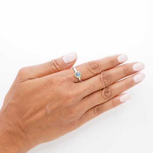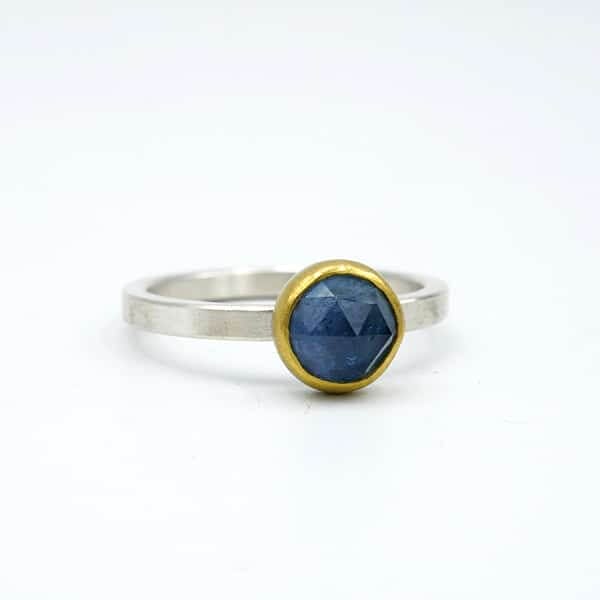 View ArtistThe Aqua Round Rose Cut Ring is one of a kind. It is made with sterling silver and has a beautiful aqua round stone encased in a 22k setting. The aqua round stone allows light to shift its color tones depending on the time of the day. With its beautiful stone, this amazing ring can be worn with everything from jeans and a t-shirt to a cocktail dress. We have a size 6.75 in stock, but should you need a different size, then it can be resized and shipped out to you within 2 weeks. The Aqua Round Rose Cut Ring is handmade by Sam Woehrmann.