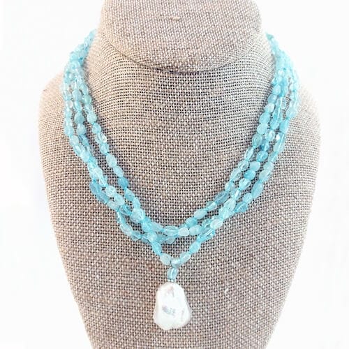 The Aquamarine and Freshwater Pearl Necklace is a wonderful piece. Triple strand of natural aquamarine with large freshwater baroque pearl pendant and strong magnetic clasp. The necklace is 18″ long. Every necklace is handmade and uses one of a kind pearls and stones to be made. As a result colors and pearl or stone sizes may slightly vary.
