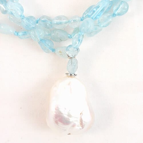 To prevent their shell from chipping, the pearls separated by knots. Pearls promote peacefulness and signify many happy memories. They are also the birthstone for June. Aquamarine and Freshwater Pearl Necklace by The Island Pearl.