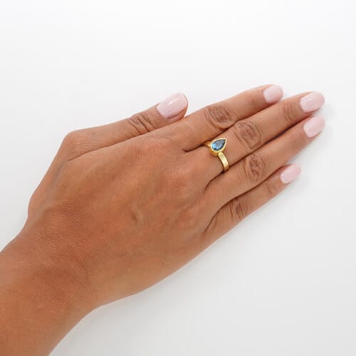 View ArtistThe Aquamarine Teardrop Ring is one of a kind. It is made with 22k yellow gold and has an unbelievably eye catching teardrop that is simply breathtaking. A truly beautiful piece that is perfect for an alternative bridal engagement ring. This aquamarine stone is 1.53 carats, but the artist will look for a similar stone to design your ring. The Aquamarine Teardrop Ring is handmade by Sam Woehrmann.