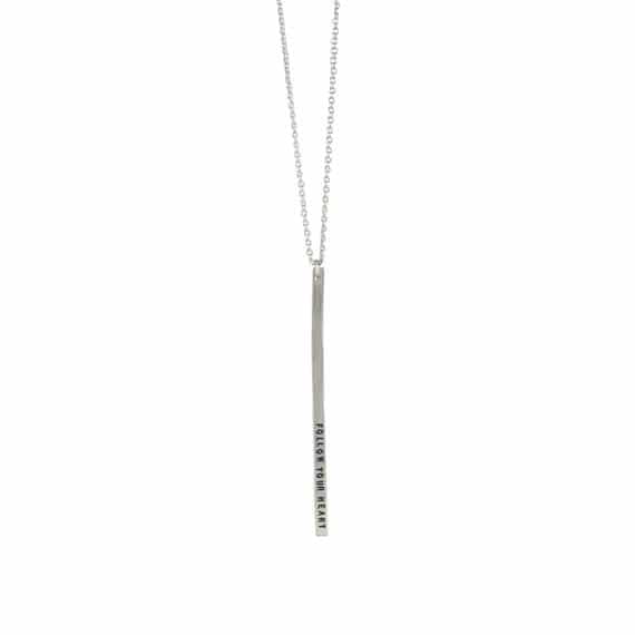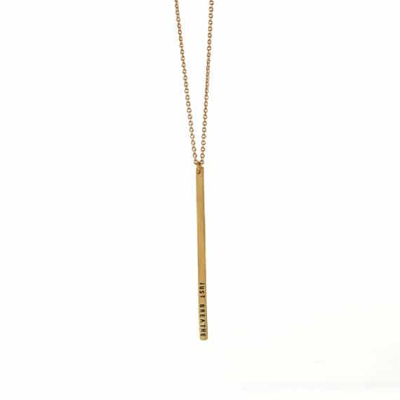 The bar necklace features a hand stamped message simple type style font. The long bar slides on an adjustable necklace chain for ease of wear.