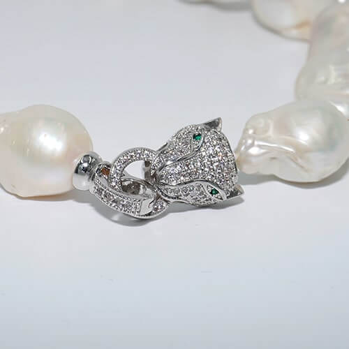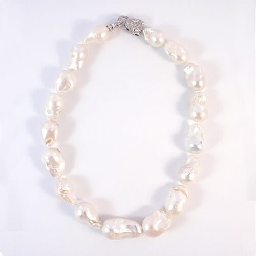 The Baroque Pearl Necklace is one of The Island Pearls most magnificent pieces. It is approximately 18″ long with large white AAA quality freshwater baroque pearls. The chain is held together with a large silver and crystal O clasp. Every necklace is handmade and uses one of a kind pearls and stones to be made. As a result colors and pearl or stone sizes may slightly vary.