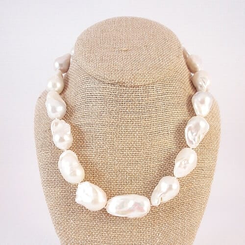 To prevent their shell from chipping, the pearls separated by knots. Pearls promote peacefulness and signify many happy memories. They are also the birthstone for June. Baroque Pearl Necklace by The Island Pearl.