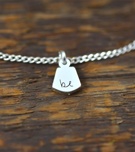 View ArtistThe Be Tag has original handwriting laser cut from recycled sterling silver, brushed finish, 16″ sterling silver chain, 6031s. It is a beautiful necklace.