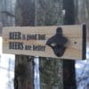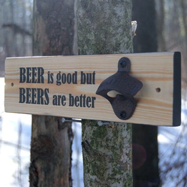 Not only is this wall mounted bottle opener functional but it is also a piece of wall art. Every bottle opener is constructed from 100% reclaimed wood from shipping pallets giving each bottle opener a unique appearance. All text, graphics and board edges are painted then coated with a water based satin polycrylic finish. Say It Don’t Spray It: Beer is good but beers are better