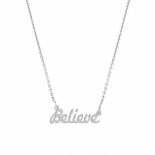 The Believe Script Necklace by Maya J is so elegantly simple that it’s hard to imagine not wearing it yourself. The 1″ wide pendant hangs on a 16″ necklace with a 2″ extender. It is brass plated in yellow or white gold vermeil. Believe Script Necklace by Maya J.