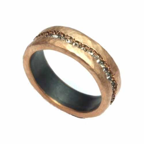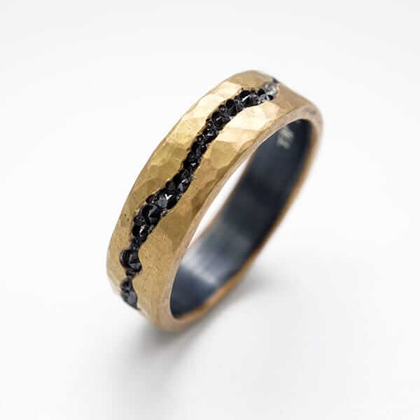 The Black Diamond R048 is handmade by Todd Pownell. The band is 6mm wide and made with 18k yellow gold over oxidized silver. It has a fissure cut set with inverted black diamonds. It comes in Yellow Gold or Rose Gold, and there’s even a stunning Platinum version for a more refined look. Black Diamond R048.