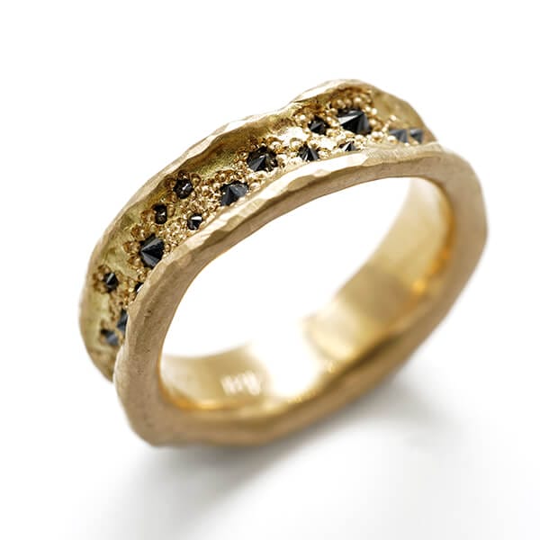 View ArtistThe Black Gold is approximately 6.5mm wide and handmade with solid 18K yellow gold. The ring has a very organic shape with raised edges and is sprinkled black diamonds totaling approximately 1.4 carats set within the fissure. The ring’s unique shape and design is truly eye catching. And since each ring is one of a kind, it’s designed to impress anyone who wears it. R231y. We have a size 9.5 in stock, but it can be resized in as little as 2 weeks.