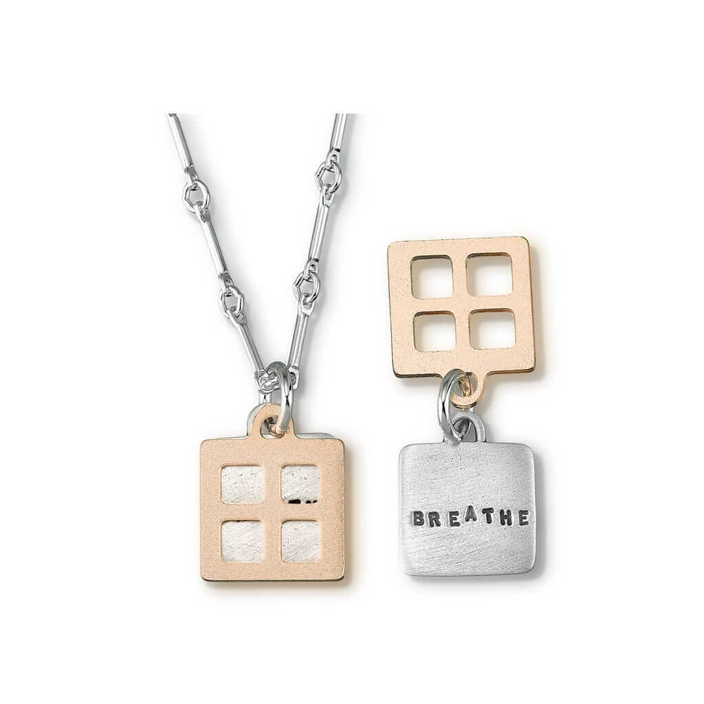 View ArtistThis Kathy Bransfield necklace is titled Breathe. It is made of 18kt gold plated bronze and silver necklace, 16″ bar link chain, 1/2″ x 1/2″ pendant. QUOTE: “Breathe”