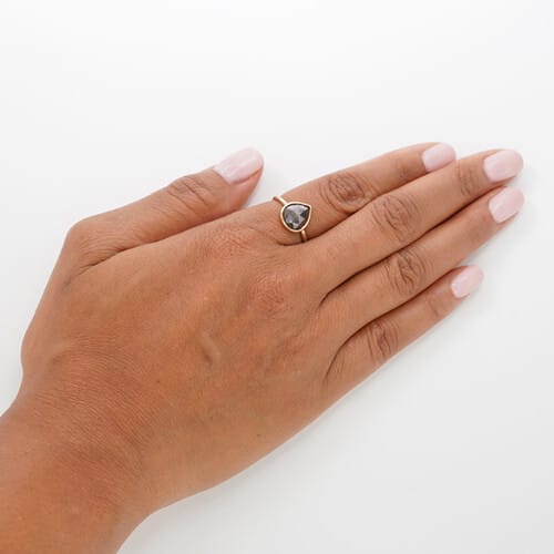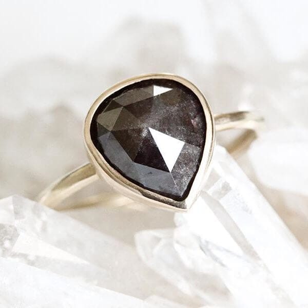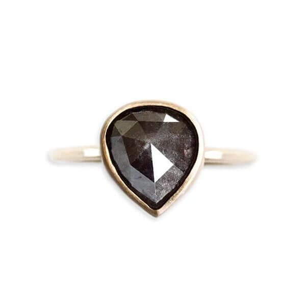 The Chocolate Rose Cut Diamond Ring has a gorgeous natural pear rose cut diamond is cradled in a handcrafted Recycled 14k gold bezel. This Diamond has tones of deep chocolate brown. There is even a small surface inclusion near the side towards the front which helps to capture the true beauty of having a natural diamond. The Rose Cut Diamond is 10.08 x 8.9 x 4.5mm in size and is 2.93 carats. The hammered 1.7mm wide band is made of Brushed 14K Yellow Gold. We have size 7.25 in stock and ready to ship. The Chocolate Rose Cut Diamond Ring is designed by Andrea Bonelli.