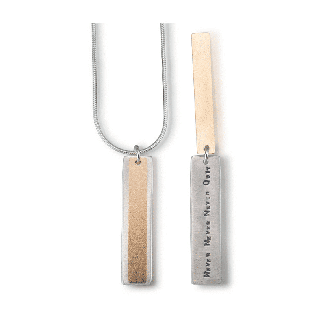 View ArtistThis Kathy Bransfield necklace is titled Churchill. It is made of 22k gold plated brass and sterling silver, 18″ snake chain, and 1 and 1/2 x 3/8 in. pendant, TEXT: “Never Never Never Quit!” – Winston Churchill