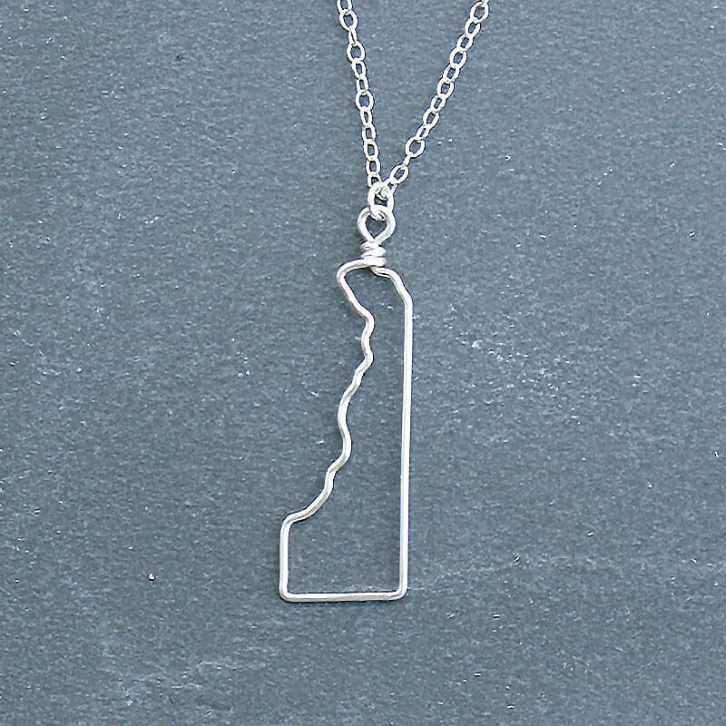 View ArtistThis delicate Delaware Outline Necklace is made from sterling silver wire and intricately hand formed into the outline of the state. No generic machine cut outs here! Each necklace comes on a 18″ sterling chain. Mini sizes are approximately 1/2″ to 3/4″ depending on the state. Standard sizes are approximately 1.5″ to 2″ wide. (Standard shown.)