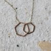 The Double Hex Necklace is a funky take on the classic interlocking circle necklace. 16″ – 18″ long, with a cute hex tag near the clasp. Available in sterling silver, oxidized silver, or 14k gold fill.