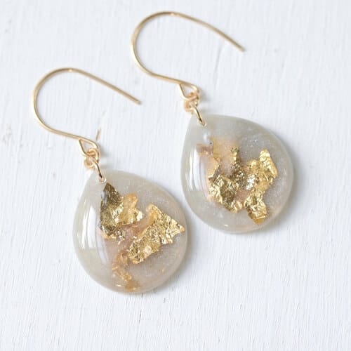 These dove grey large teardrop earrings are filled with dove grey resin, then gold leaf and glitter are carefully added. They hang from hand formed 14 karat gold filled ear wires with rubber backs. Resin is very lightweight, so you won’t even notice these on your ears. They measure approximately 1.75″ inches total length. Each pair of these will be slightly different, as they are all handmade. Dove Grey Large Teardrop Earrings