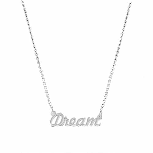 The Dream Script Necklace by Maya J is so elegantly simple that it’s hard to imagine not wearing it yourself. The 1″ wide pendant hangs on a 16″ necklace with a 2″ extender. It is brass plated in yellow or white gold vermeil. Dream Script Necklace by Maya J.