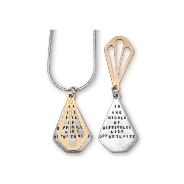 View ArtistThis Kathy Bransfield necklace is titled Einstein. It is made of 18k Gold plated bronze and brushed Silver, 18″ Snake Chain, 1 & 1/4″ x 3/4″ pendant, TEXT: “In the middle of difficulty lies opportunity.” – Albert Einstein