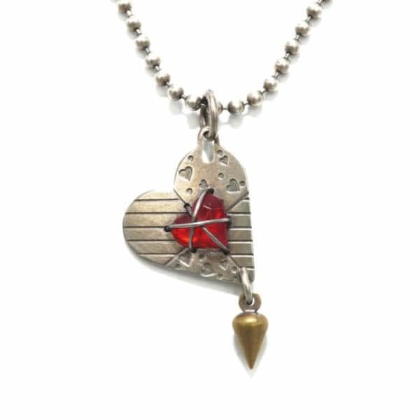 The Etched Heart with Crystal Necklace is made with etched nickel, brass and steel wire. It has a 18″ Sterling Silver chain with hook closure and a pendant that measures 1 1/2″ long x 3/4″ wide. This piece goes great with the Small Etched Heart with Crystal Earrings! This necklace is made by famed handmade jewelry designer, Thomas Mann.
