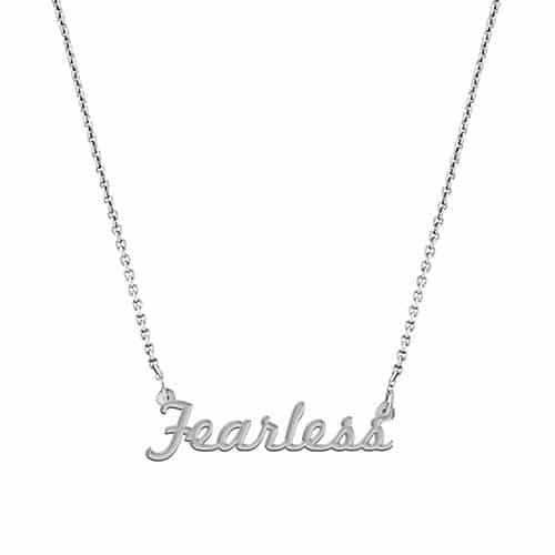 The Fearless Script Necklace by Maya J is so elegantly simple that it’s hard to imagine not wearing it yourself. The 1″ wide pendant hangs on a 16″ necklace with a 2″ extender. It is brass plated in yellow or white gold vermeil. Fearless Script Necklace by Maya J.