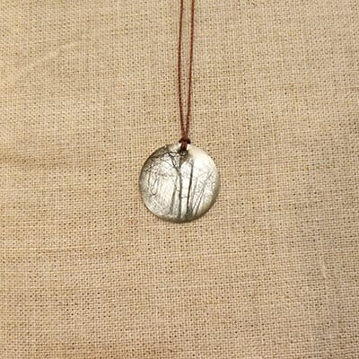 View ArtistThis Everyday Artifact necklace is titled Foggy. Miniature hand printed lithograph on a sterling silver 7/8″ disc. Finished with a durable epoxy coating. 18″ nylon cord with a sterling clasp.