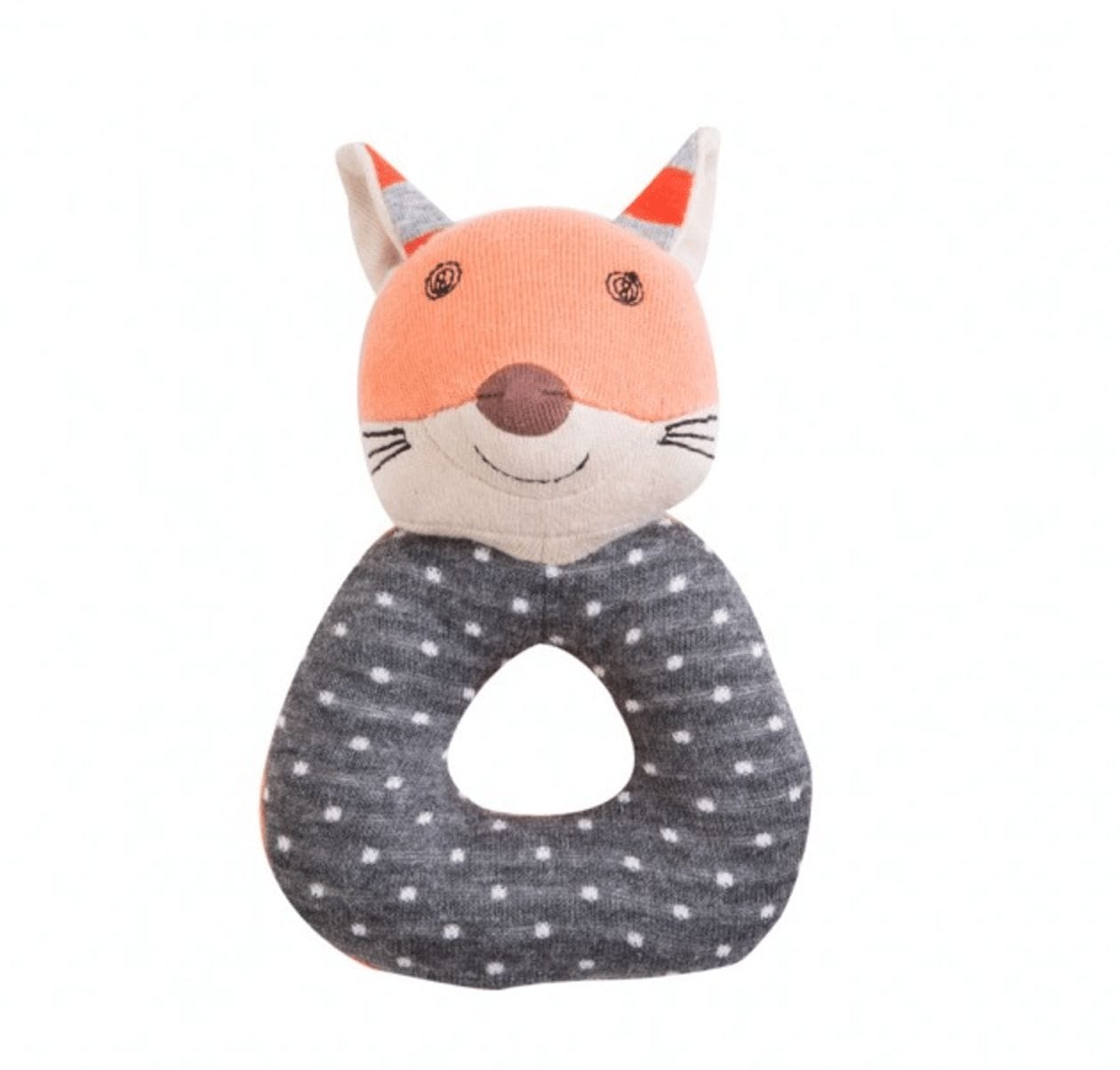 View ArtistThe Frenchy Fox Teething Rattle is made of 100% organic cotton fabric. It uses hypoallergenic sustainable corn fiber filler and is sized at 4 x 6Â inches. Packaging: recycled paper printed with soy ink.