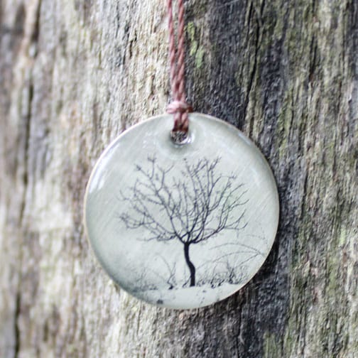 View ArtistThis Everyday Artifact necklace is titled Fruit Tree. Miniature hand printed lithograph on a sterling silver 7/8″ disc. Finished with a durable epoxy coating. 18″ nylon cord with a sterling clasp.