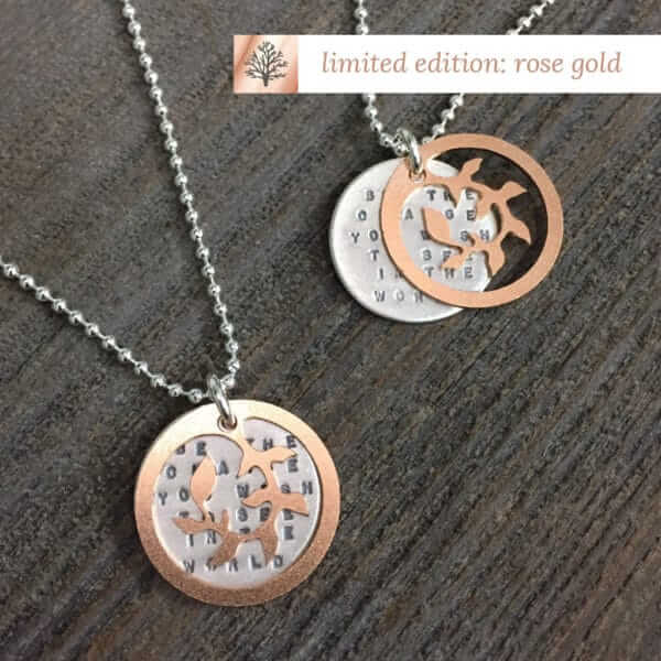 This Kathy Bransfield necklace is titled Gandhi Ivy Rose Gold Necklace. It is made of Sterling Silver and Rose Gold plated brass, 16″ Ball chain, 5/8″ pendant, TEXT: “Be the Change you Wish to see in the World” – Mahatma Gandhi