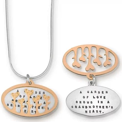 View ArtistThe Garden of Love Necklace is designed by Kathy Bransfield. It is made of 22k Gold plated bronze and brushed sterling silver. The inscription sits underneath the gold plated brass. It has an 18″ snake chain and a 3/4″ pendant which reads: “A garden of love grows in a Grandmother’s heart”.