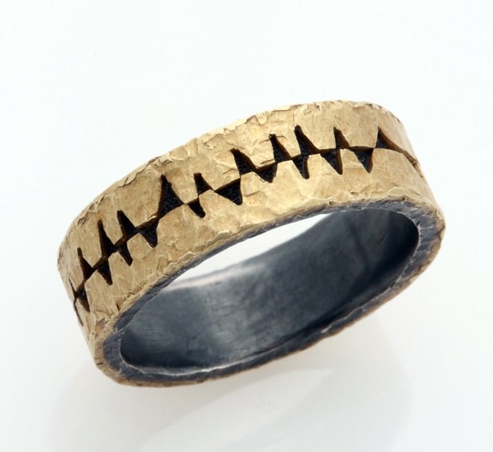 The GR030 Ring is handmade by Todd Pownell. The 7mm wide band is designed with 18k yellow gold over oxidized silver ring with angled cuts on center the line and rustic hammered finish. GR030 Ring.