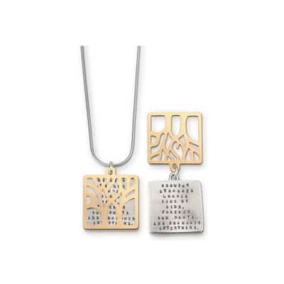 View ArtistThis Kathy Bransfield necklace is titled Growing Stronger. It is made of brushed sterling silver, 18″ snake chain, 3/4″ square pendant, TEXT: “Growing stronger longer side by side. Forever our roots and branches intertwine.”