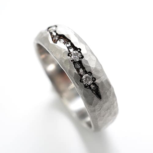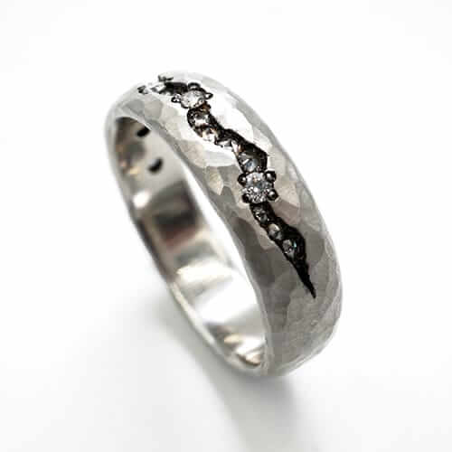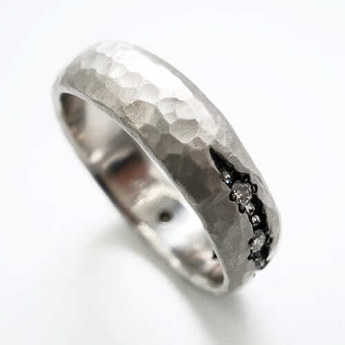 The Half Eternity Platinum Ring is 7mm wide and made of solid hammered platinum. It has an inverted single cut white or black diamonds and five larger white or black diamonds set in the fissure. The fissure is designed to only encompasses half of the ring, leaving the bottom with a beautiful solid hammered appearance. Custom R004 Half Eternity.