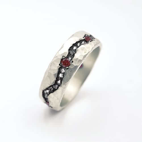 The Hammered Red Ruby Fissure is 7mm wide and made of solid hammered silver. It has an inverted single cut white diamonds and five red rubies totalling approximately .65 carats set in the fissure. Custom R004 Hammered Red Ruby Fissure.