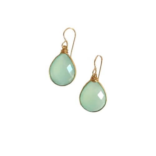 The Helena Teardrop Chalcedony Earrings are made with faceted blue Chalcedony, in a classic teardrop shape are bezel-set in gold vermeil. They are wire-wrapped by hand and hung on nickel-free ear wires. They have a 3/4″ drop. Handmade by Alexia Viola.