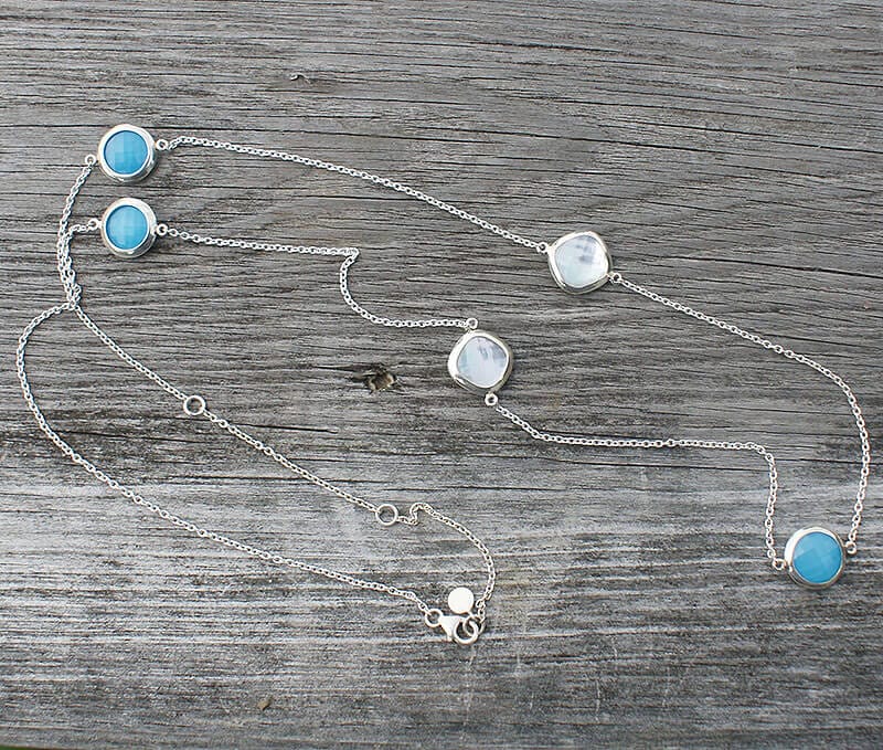 The Heredia Mother of Pearl & Turquoise Long Necklace is made of sterling silver, mother of pearl, and turquoise doublet 35″ long necklace. N500L35-MPd/TQd