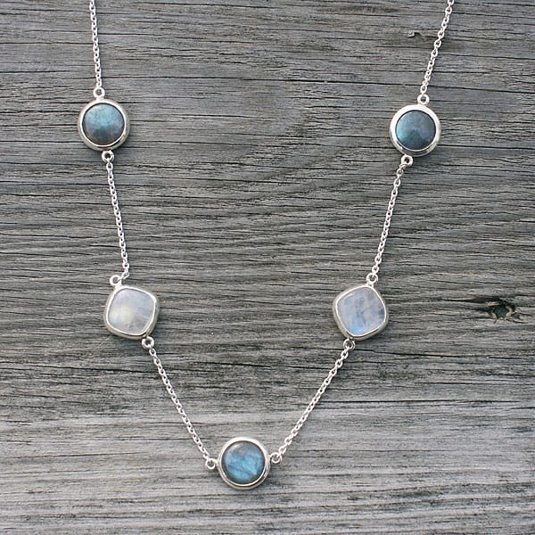 This Heredia Rainbow Moonstone and Labradorite Necklace features two rounded square rainbow moonstones, approximately 1/2″ wide, and three round labradorite stones, approximately 7/16″ wide. The adjustable sterling silver chain is 18″ in length.
