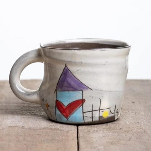 View ArtistHome Sweet Home Mug is a wheel thrown and slip trailed ceramic cup. It is signed on bottom by the artists. It’s microwave, dishwasher and oven safe. And it’s 4″H holds 14oz of your favorite drink. All cups are made by hand and will vary in size, shape, and placement of designs. The Home Sweet Home Mug is a beautiful way to start your day – “Home Sweet Home”