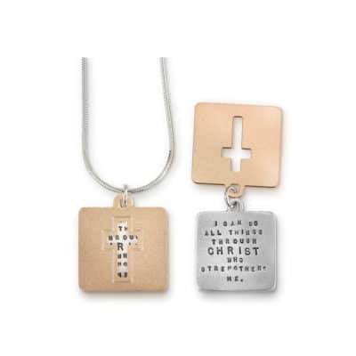 View ArtistThis Kathy Bransfield necklace is titled I Can Do All Things. It is made of 18kt Gold plated bronze and brushed Silver, 18″ snake chain, 3/4″ pendant, TEXT: “I Can Do All Things Through Christ Who Strengthens Me”
