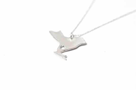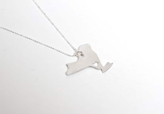 View ArtistI Heart New York. Born and raised, transplanted and proud… if your heart lives in New York, then this necklace belongs around your neck. Hand made with love and from fine silver (.999 pure), the pendant is 1″ wide, and hangs from an 18 inch sterling silver ball chain. All necklaces are made by hand, so slight variations will occur. Tru.che