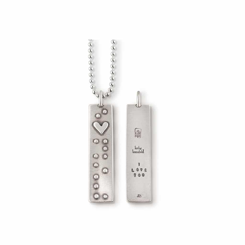 This Kathy Bransfield necklace is titled I Love You (Braille). It is made of Oxidized sterling silver, 18″ ball chain, 1.25″ x 3/8″ pendant, TEXT: “I love you” (written in Braille)
