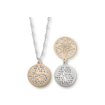 View ArtistThis Kathy Bransfield necklace is titled Leave A Trail. It is made of 18kt Gold plated bronze and brushed silver, 18″ bar link chain, 1″ pendant, TEXT: “Do not go where the path may lead. Go instead where there is no path and leave a trail.”
