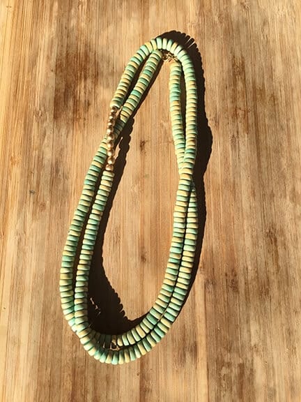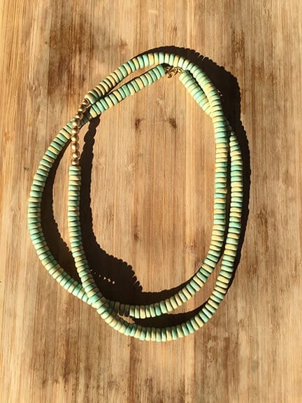 The Tara Montgomery Long Aqua Gold Wood Necklace is made of wood, golden pyrite spacers, and has a 14K gold fill clasp. It measures approximately 42” in length. 8845904. The Tara Montgomery Long Aqua Gold Wood Necklace is beautifully designed to work with jeans and a t-shirt or a fun night out on the town.