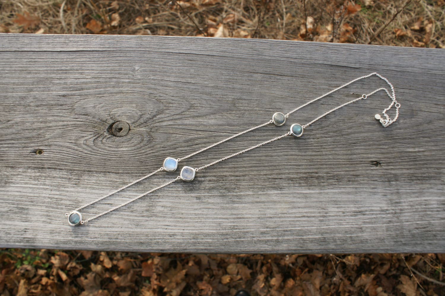 This Long Heredia Rainbow Moonstone and Labradorite Necklace features two rounded square rainbow moonstones, approximately 1/2″ wide, and three round labradorite stones, approximately 7/16″ wide. The adjustable sterling silver chain is extra long at 35″.